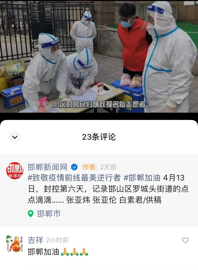 张亚炜拍摄、编辑的短视频《致敬疫情前线最美逆行者》从“团结、纪律、严谨、乐观”等方面从每个细节展现疫情防控中的温情瞬间,传递正能量,鼓舞士气,稳定民心,获得广大居民、志愿者、医护人员和罗城头街道、小学北社区的一致好评,短视频在市级媒体《邯郸新闻网》视频号刊载。