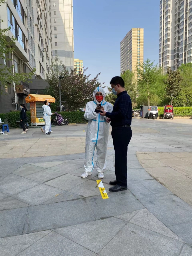 “请您出示健康码……”这是在星城国际社区,办公室职工李贞壮也是每天五点到社区换上防护服,开始协助医护人员进行核酸采集,负责扫码录入做核酸者的信息,直到采集完社区的全部人员。