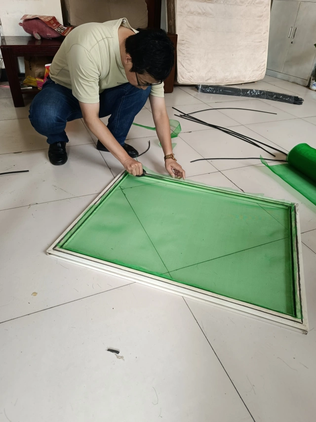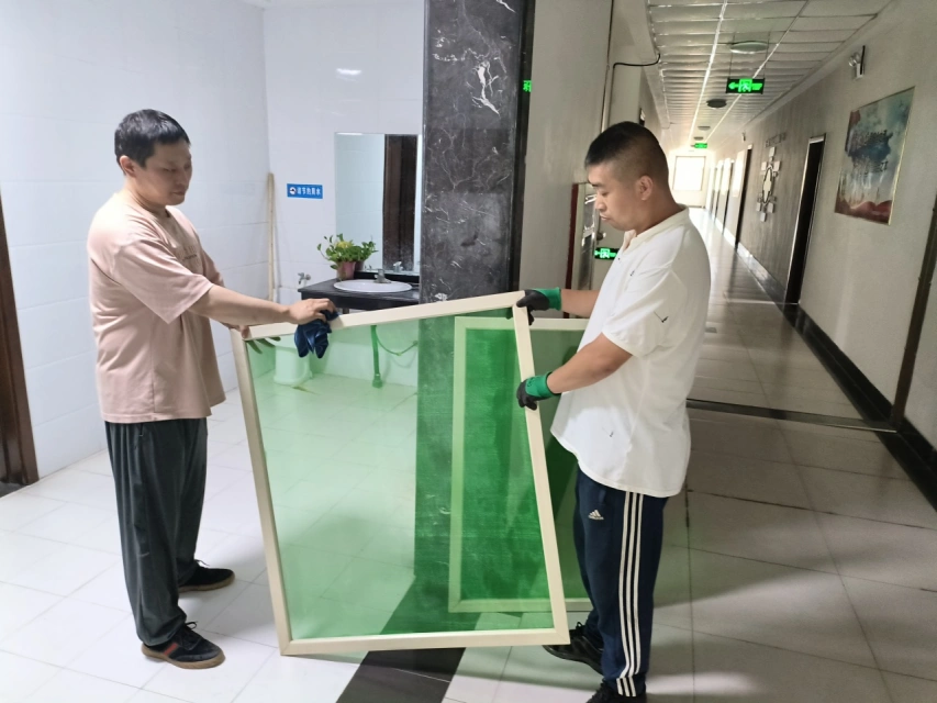 办公楼东西通风窗、卫生间窗户的纱网因使用时间较长出现破损开裂等现象,无法有效阻挡蚊虫,导致楼内蚊虫增多。综合服务中心工作人员针对这种情况,将办公楼公共区域内的老旧纱窗全部进行更换,大家面对天气闷热的环境,克服困难、分头行动,经过拆卸、裁剪、清洁、安装等步骤,在将近一天的工作后,更换纱网20扇左右。