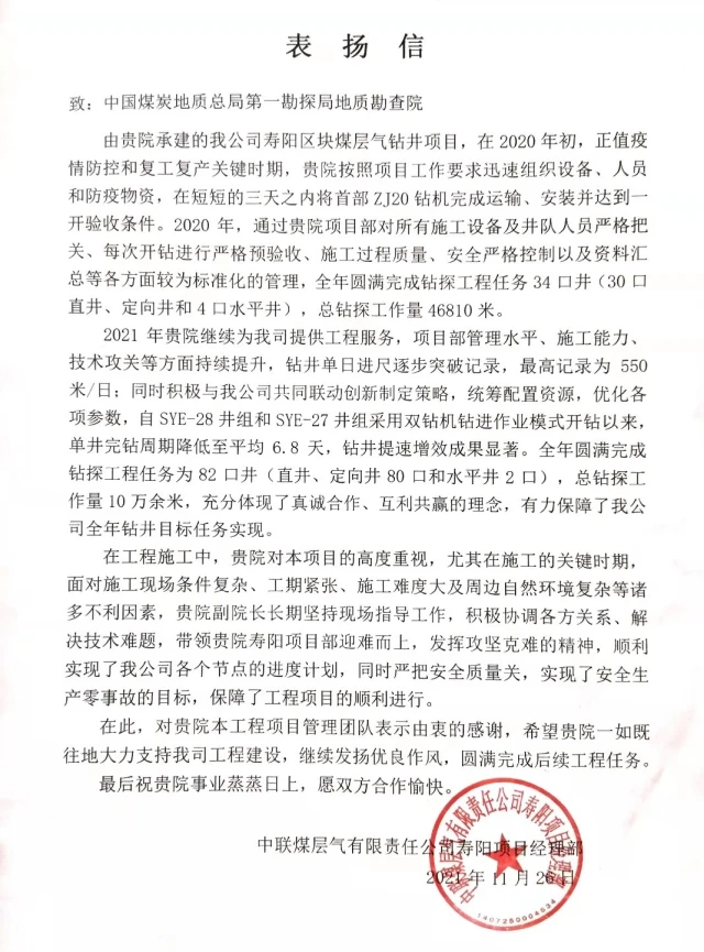 近日,勘查公司收到一份中联煤层气有限责任公司寿阳项目经理部发来的表扬信,高度赞扬和感谢勘查院在工程建设过程中,严把安全、质量和资料验收汇交等各环节管控,优质高效的保障了全年钻井任务目标的实现。