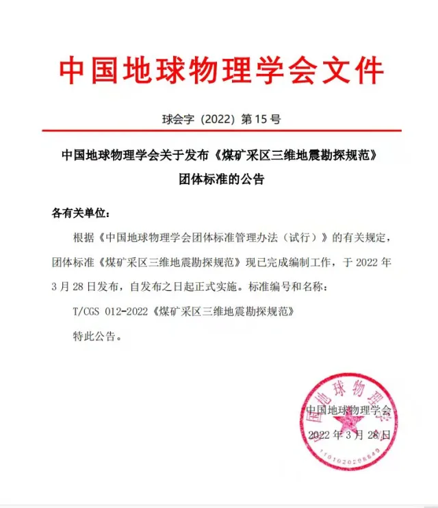 3月28日,由中国地球物理学会批准立项、中国煤炭地质总局牵头、物测公司参与起草的《煤矿采区三维地震勘探规范》团体标准发布实施。