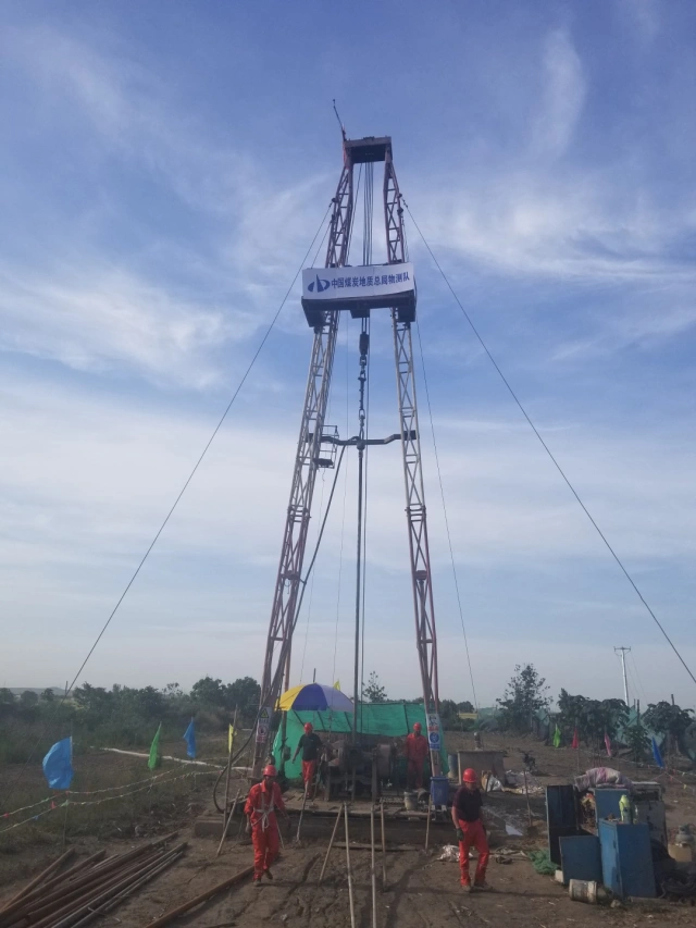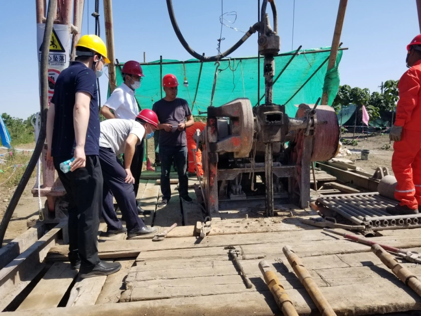 在施工现场,亓增刚检查了钻机班报表及岩芯鉴定表的记录情况,指出施工要规范操作设备,努力提高岩芯采取率,防止孔内事故发生,并针对岩芯样品的鉴定方法及岩石倾角的测量方式进行了讲解。