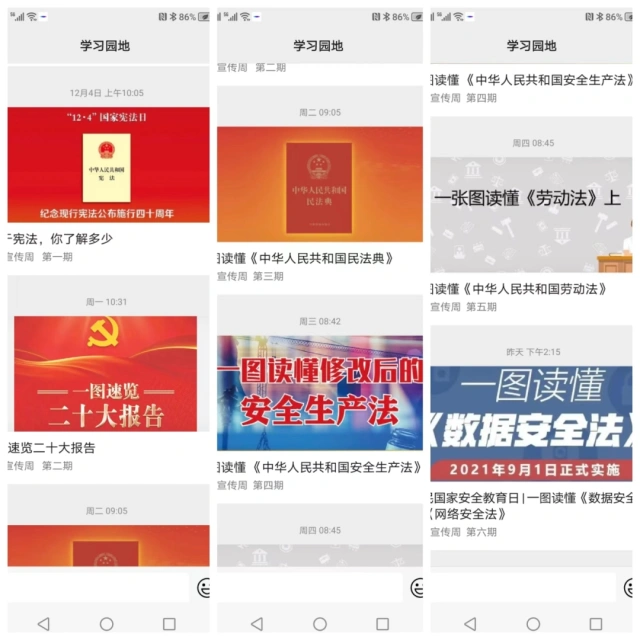 利用一周时间对重点宣传内容《党的二十大精神》、《中华人民共和国宪法》、《中华人民共和国民法典》及与企业经营管理相关的法律法规等进行了学宣贯,为方便职工学习查看,在一二九公司公众号学习园地每天定时推送。