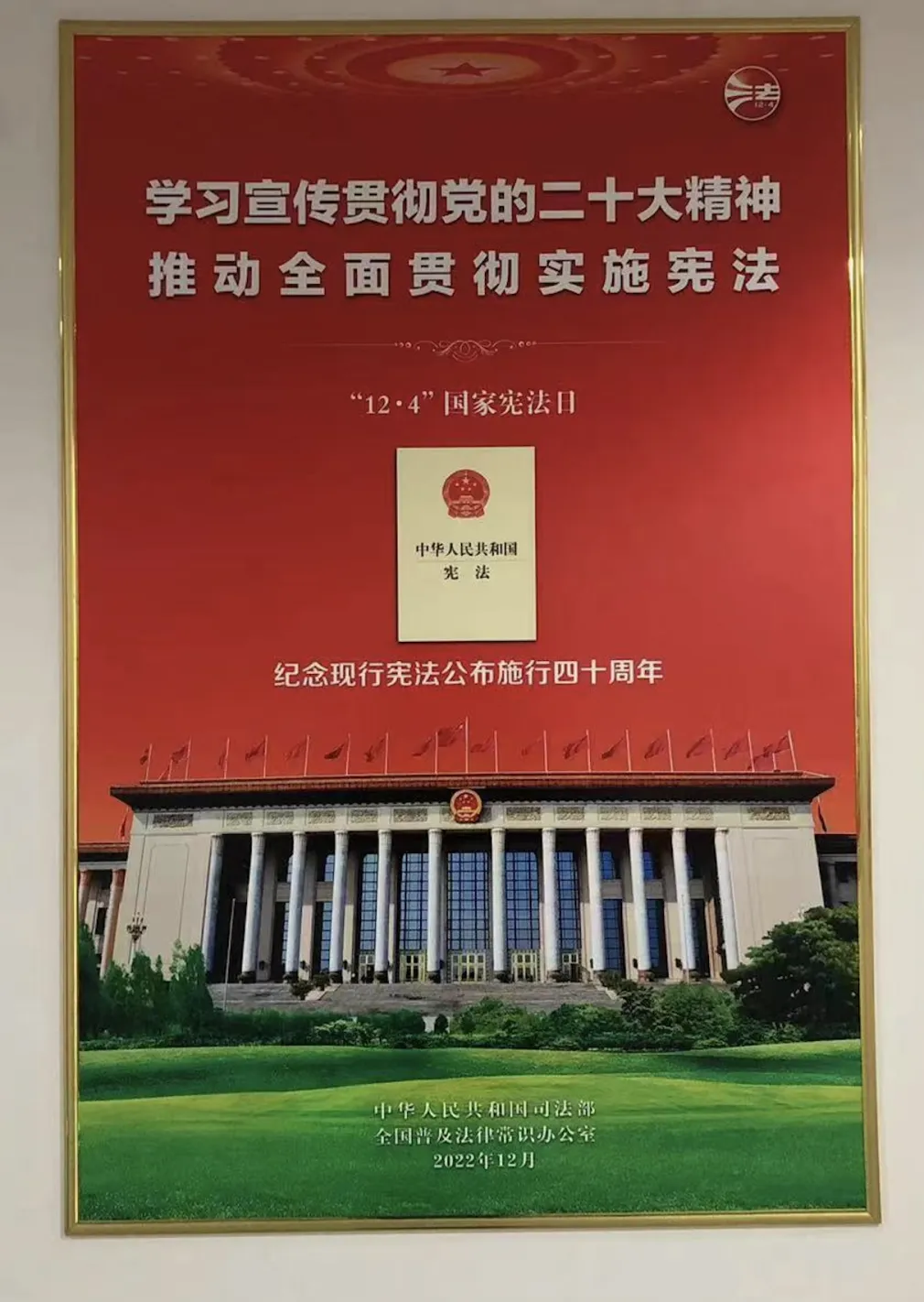 在一二九公司办公楼内醒目地方张贴大幅宪法宣传海报,庆祝“第九个国家宪法日”。