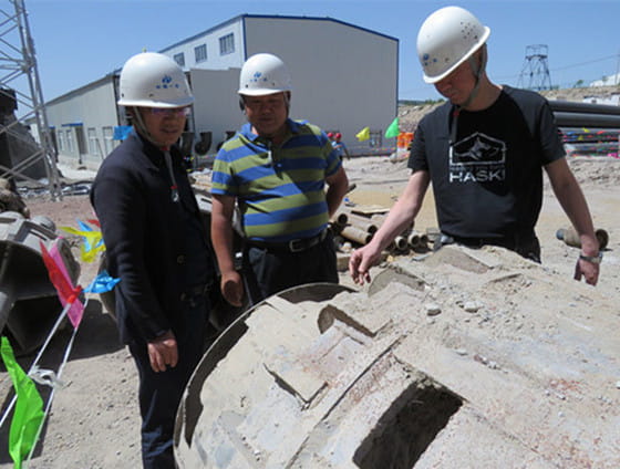 在现场,冀涛局长先后听取项目负责人汇报现场施工情况,并亲自上钻机检查和询问了钻机钻进情况,还与技术人员、工人代表等进行了座谈。通过座谈了解到,该项目在施工过程中,由于存在采空区,导致施工过程中漏水非常严重,造成了施工困难,为了克服这一技术难题,一二九队召集相关技术人员连夜研究方案,制定措施,最终将孔径增加到了φ1800mm,并成功下入φ1520mm的套管隔开采空区。该项目是最大施工口径达到“φ1800mm”,标志着一二九队钻探历史性突破和钻探技术创新纪录。