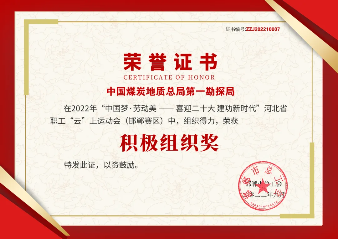 为深入贯彻落实习近平总书记关于工人阶级和工会工作的重要论述,打造健康文明、昂扬向上的一局集团职工文化,今年上半年,集团公司积极组织参加河北省总工会举办的“中国梦· 劳动美---喜迎二十大 建功新时代”职工“云”上运动会,在邯郸市参赛的2294个团组单位中喜获积极组织奖,全市仅18家单位获此殊荣。